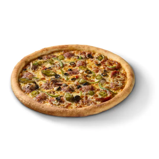 پیتزا پپرونی از خمیر پیتزا، سس گوجه، پنیر موزارلا و برشهای پپرونی